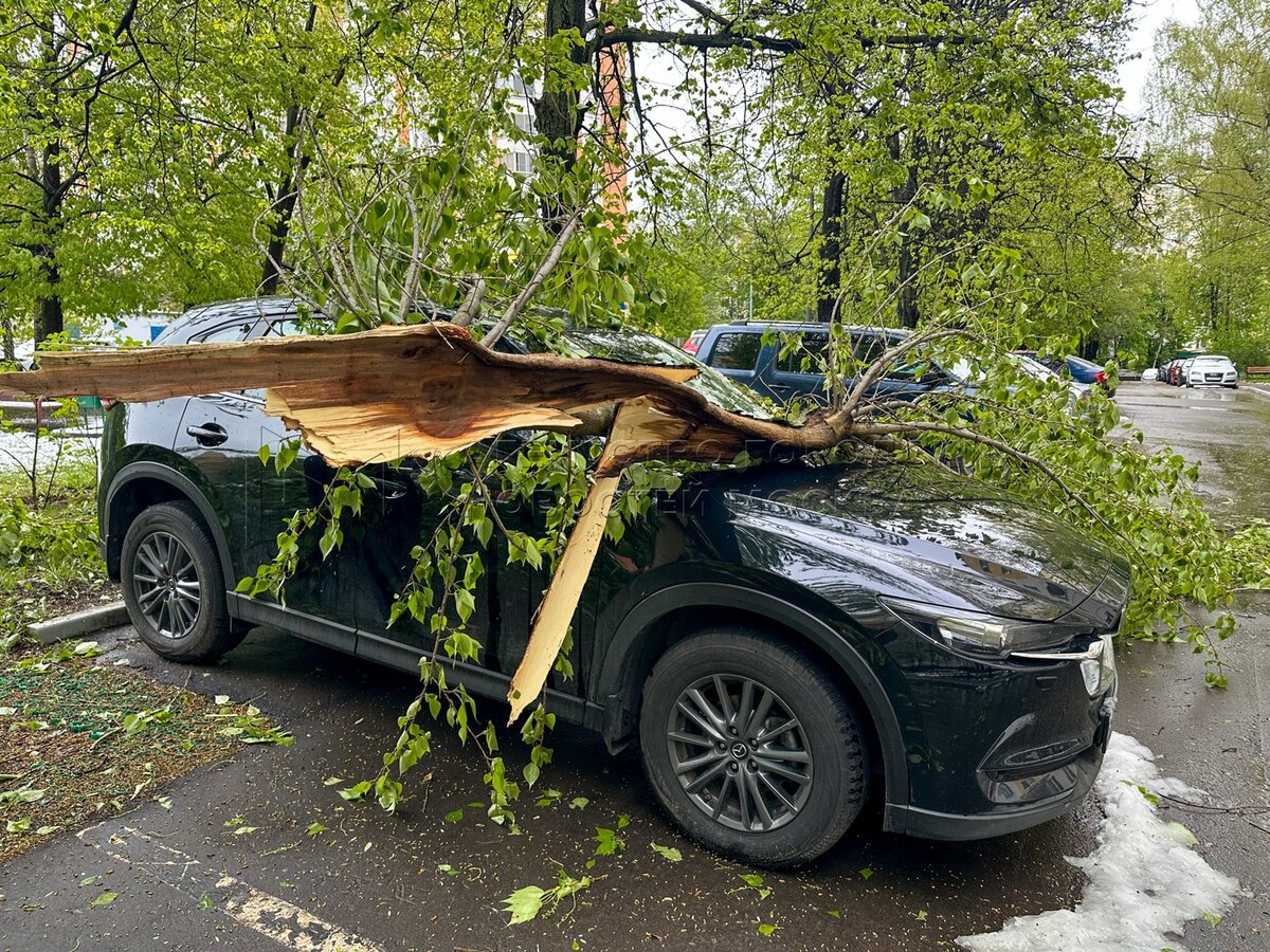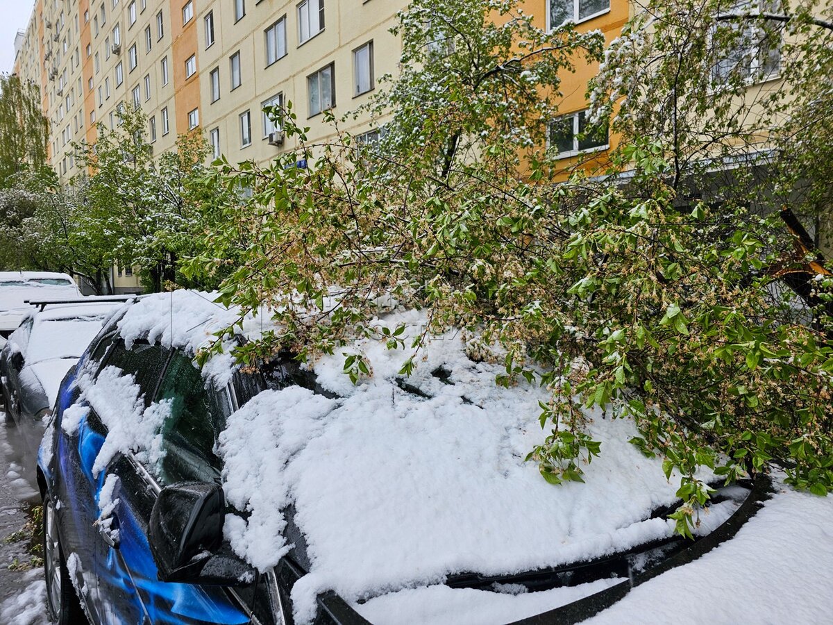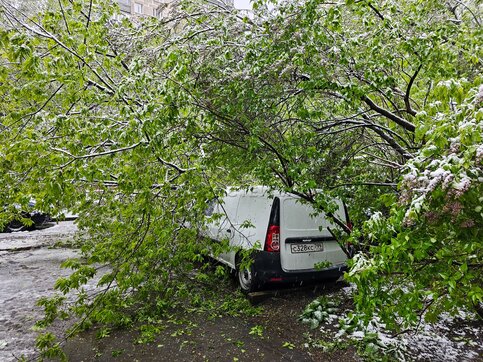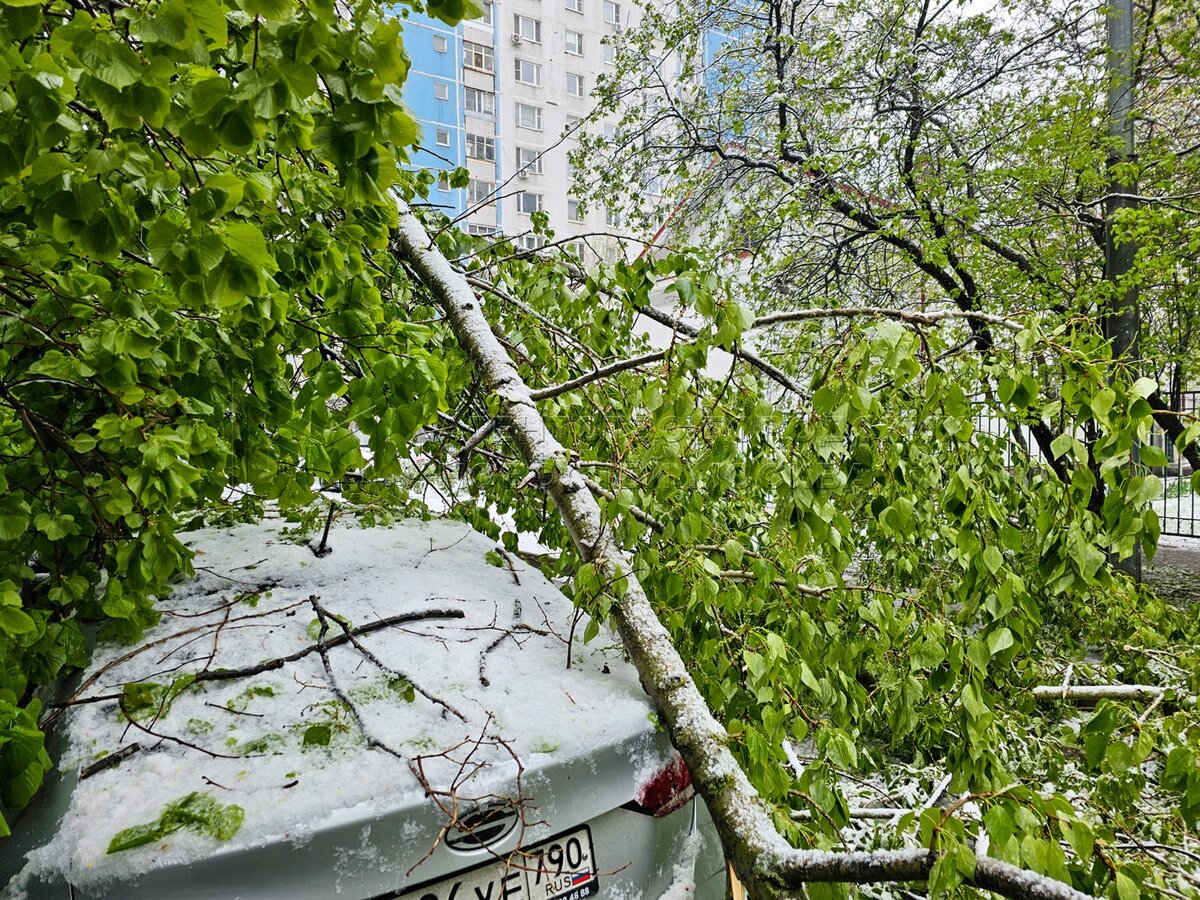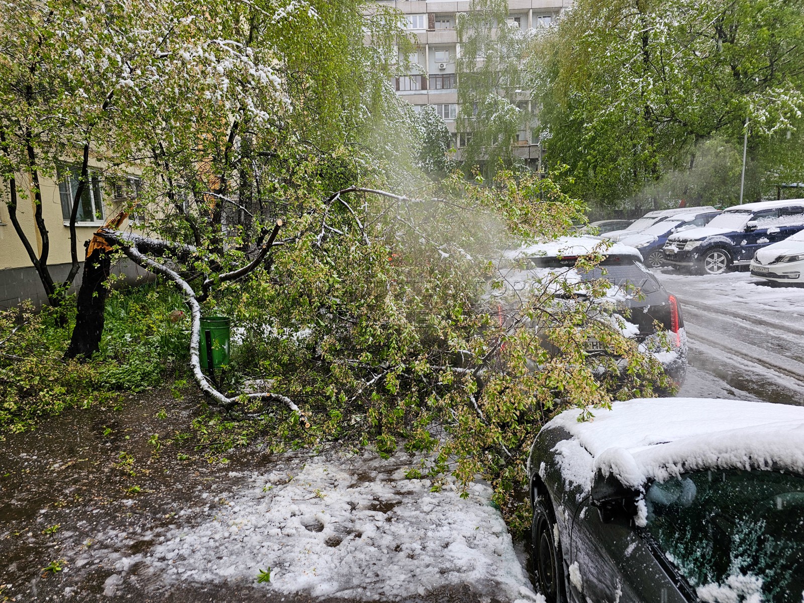 - Заголовок: Последствия падения деревьев на автомобили во дворах из-за мокрого снега в Москве