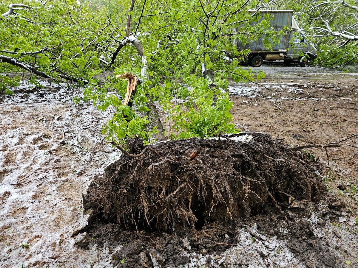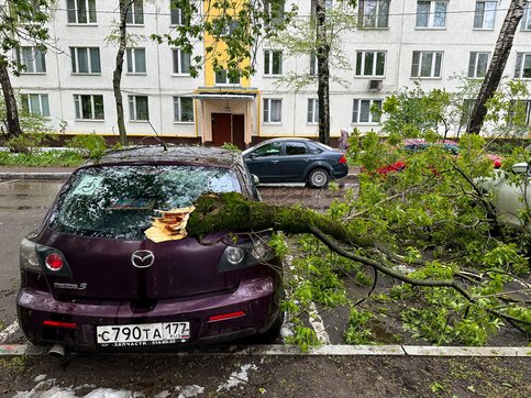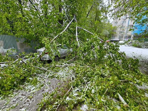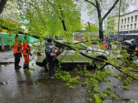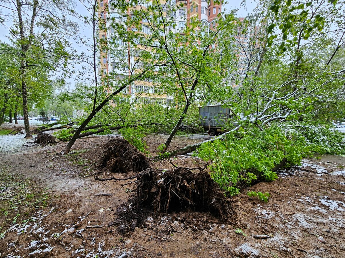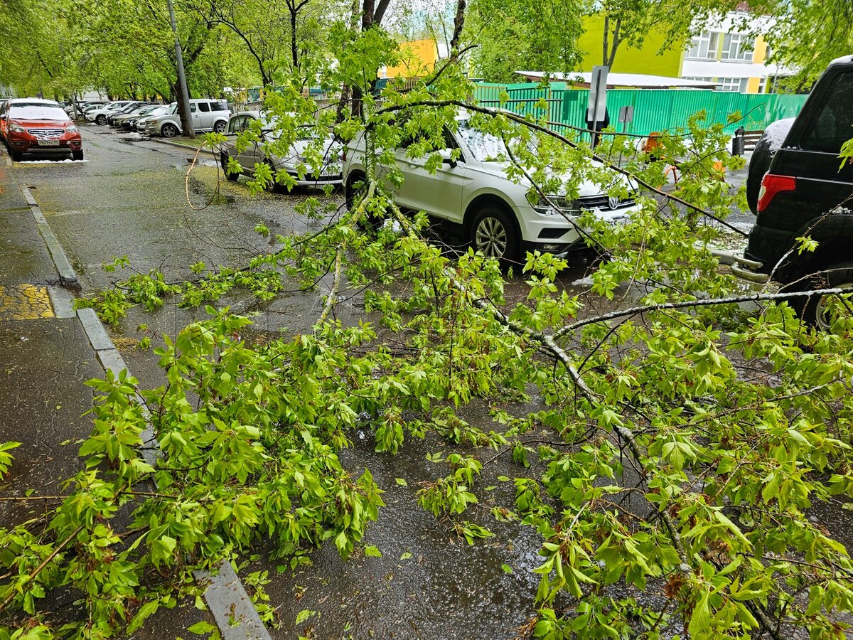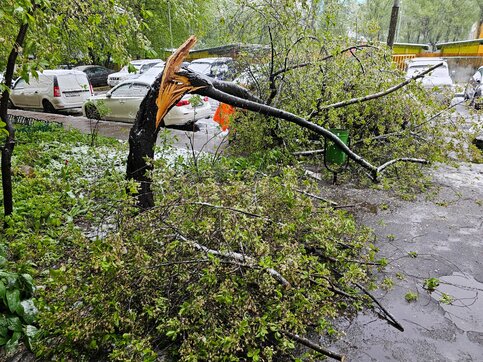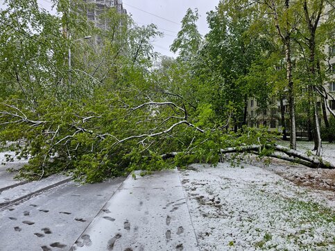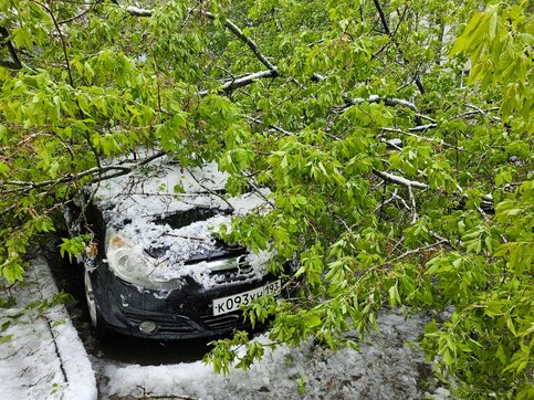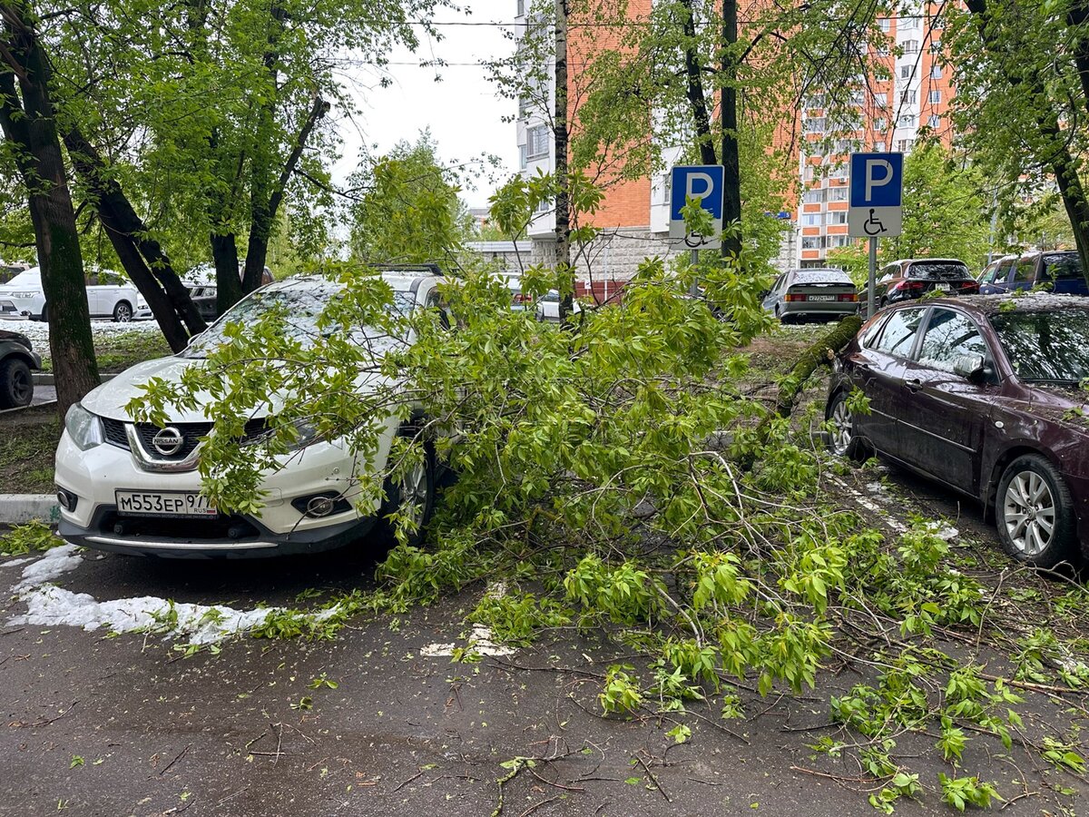 - Заголовок: Последствия падения деревьев на автомобили во дворах из-за мокрого снега в Москве