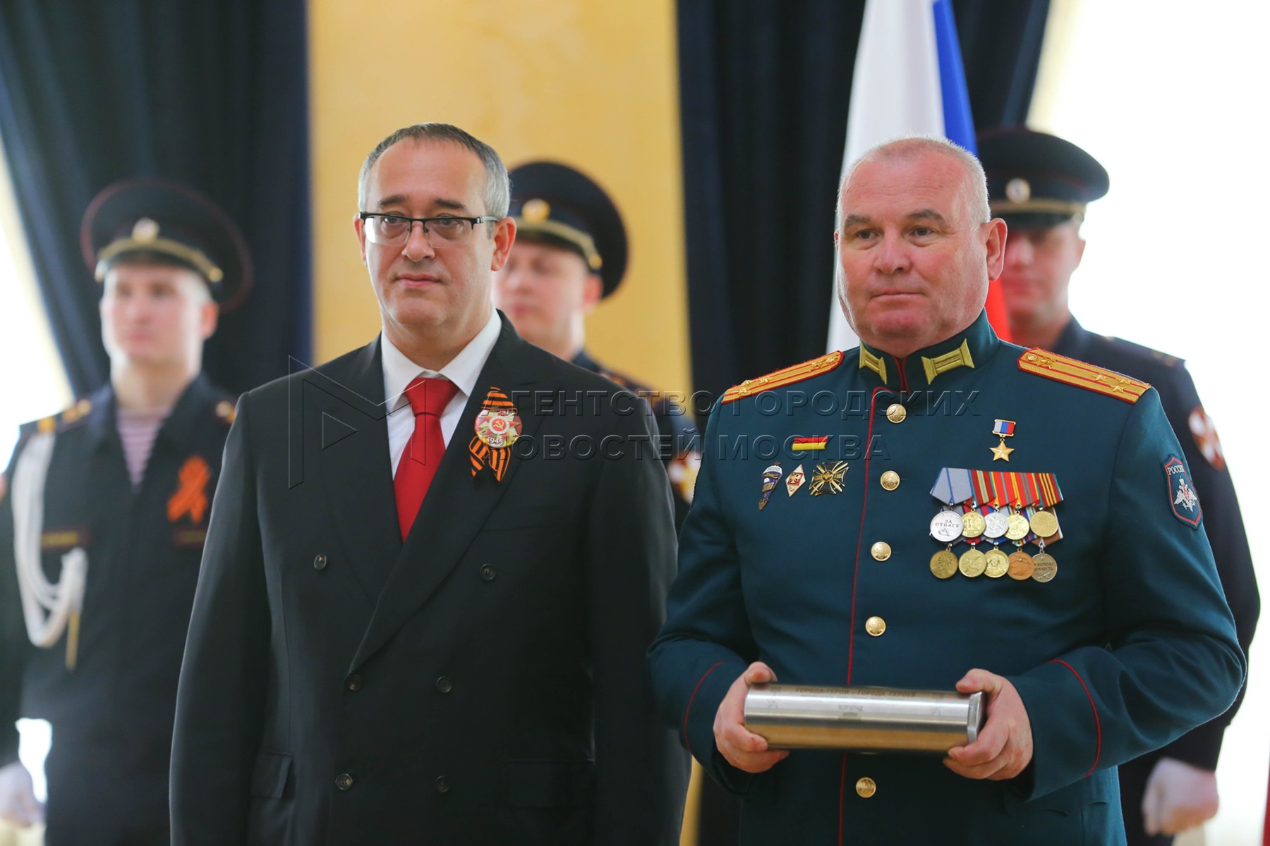 - Описание: Передача командами автопробега «Города-герои – города героев» капсул с землей из 11 городов-героев России и Белоруссии председателю Московской городской думы Алексею Шапошникову в день 60-летия присвоения столице звания «Город-герой».